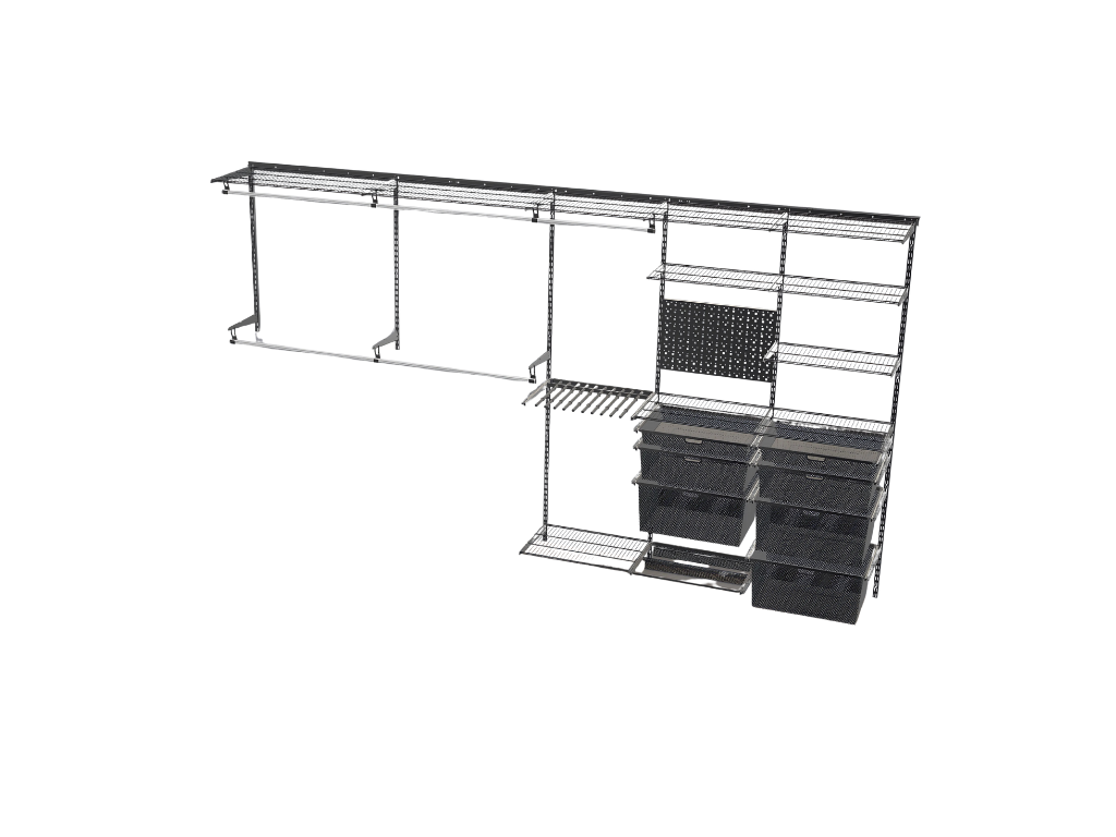 Bộ sản phẩm gồm: Thanh ray gắn tường | Thanh đứng gắn tường | Kệ lưới | Khung keo | Thanh treo | Móc treo | Giỏ lưới  | Giá đỡ kệ | Kệ trượt treo quần | Tấm đục lỗ, để móc trang phục như khuyên tai, ghim cài, v.v. | Kèm đầy đủ phụ kiện lắp ráp như ốc vít và tắc kê