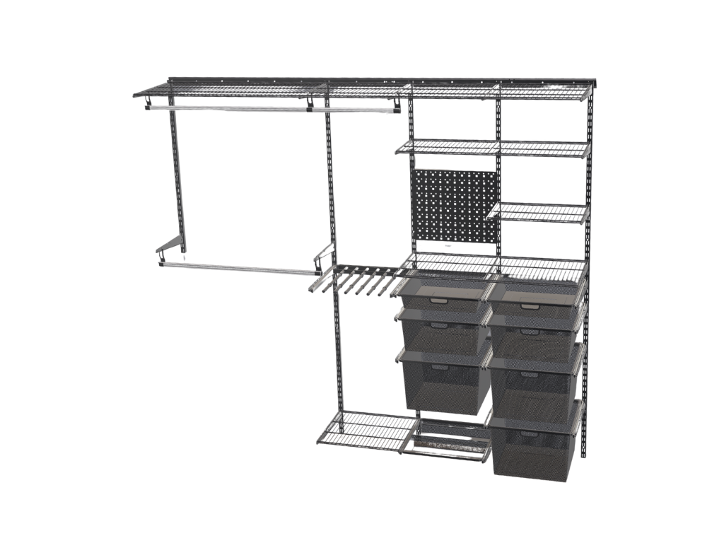 Bộ sản phẩm gồm: Thanh ray gắn tường | Thanh đứng gắn tường | Kệ lưới | Khung keo | Thanh treo | Móc treo | Giỏ lưới  | Giá đỡ kệ | Kệ trượt treo quần | Tấm đục lỗ, để móc trang phục như khuyên tai, ghim cài, v.v. | Kèm đầy đủ phụ kiện lắp ráp như ốc vít và tắc kê