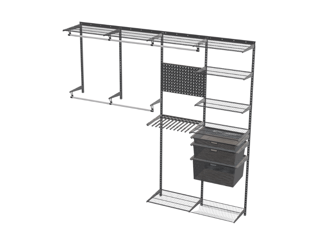 Bộ sản phẩm gồm: Thanh ray gắn tường | Thanh đứng gắn tường | Kệ lưới | Khung keo | Thanh treo | Móc treo | Giỏ lưới  | Giá đỡ kệ | Kệ trượt treo quần | Tấm đục lỗ, để móc trang phục như khuyên tai, ghim cài, v.v. | Kèm đầy đủ phụ kiện lắp ráp như ốc vít và tắc kê
